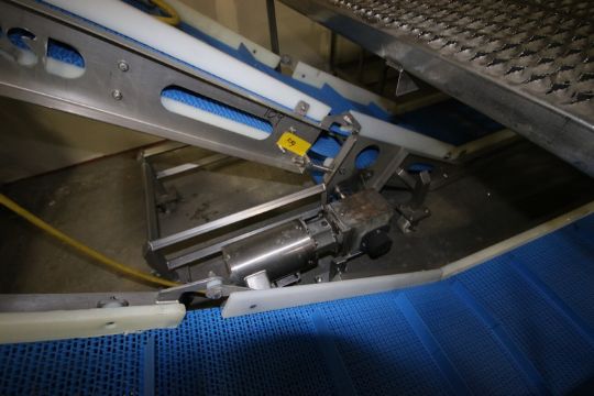 FPS S/S Incline Conveyor, Overall Length: Aprox. 9 ft. L, with Aprox. 18” W Belt, with Cleats , 52” L Flat Section, Discharge Height 55”, Mounted on Portable Frames with Drives (HANDLING, LOADING, & SITE MANAGEMENT FEE: $200.00 USD--MUST PICK UP JUNE 2ND & JUNE 3RD; MUST HAVE DOCK LEVEL TRUCK) (LOCATED IN PLOVER, WI)