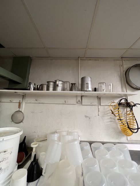 TABLE WITH S/S TOP MOUNTED ON CASTERS, ASSORTED KITCHEN SUPPLIES, INCLUDES KNIVES, SCOOPS, FUNNELS AND MORE, APPROX. TABLE DIMS: 44" X 28" 38" LWH