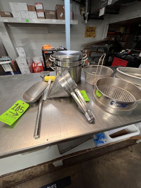 ASSORTED COOKING AND BAKING UTENSILS, S/S SCOOP, S/S PADDLE, S/S SIEVE, S/S FILTERS, POTS, PANS AND MORE