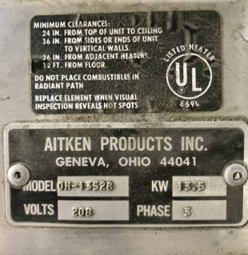 Aitken Products Inc. Heater, M/N OH-1352B, 208 Volts, 3 Phase (LOCATED IN BLAIRSVILLE, PA)