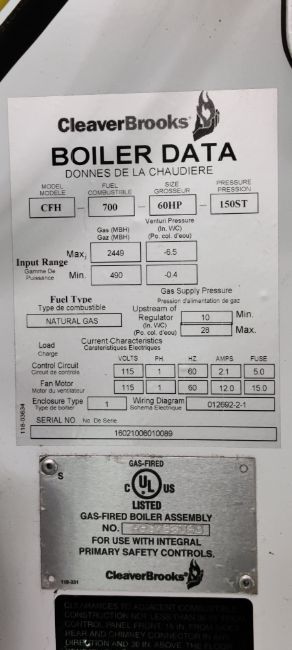 CLEVER BROOKS 60-HP BOILER, MODEL CFH, S/N 16021006010089, 150 ST PRESSURE, NATURAL GAS (BOILER 1)