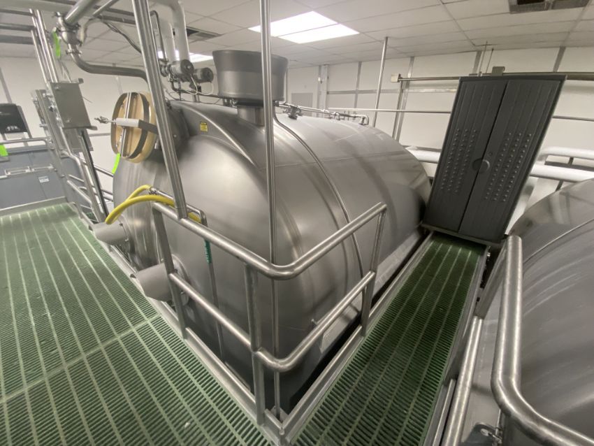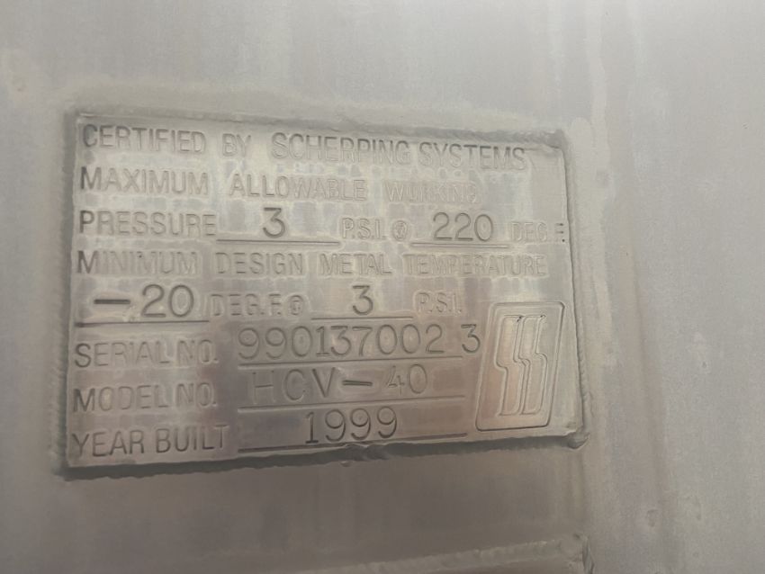 Scherping Systems S/S Horizontal Jacketed Cheese Vat, M/N HCV-40, S/N 9901370023, Max. Allowable Pressure: 3 PSI @ 220 Deg. F, Min. Design Metal Temp. -20 Deg. @ 3 F, with 7.5 hp Rear Mounted Motor, 230/460 Volts, 3 Phase, with Rear Mounted Motor, Mounted on S/S Legs.  Includes (4)4", (2)3", (2)1.5", and (1)1" WCB Valves (LOCATED IN SAN BENARDINO, CA)(RIGGING, LOADING, & SITE MANAGEMENT FEE: $5,000.00 USD)