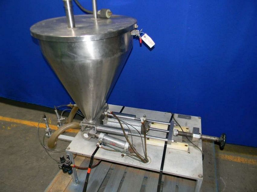 Qty (1) Geyer Semi Automatic Twin Piston Filler - Platform mounted Geyer twin piston Filler - 16 oz Piston Capacity - Pneumatic controlled Piston Filler - Hopper size is 24' x 24' x 6' tall (aprox. 2 cu ft) - 32' x 44' x 72' footprint. - 120 V., Model , S/N 2595