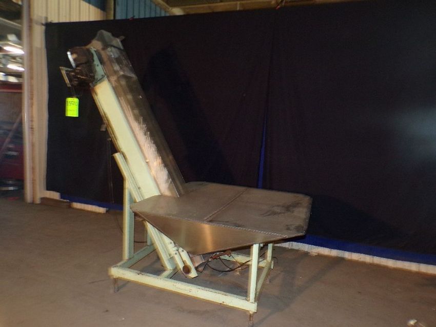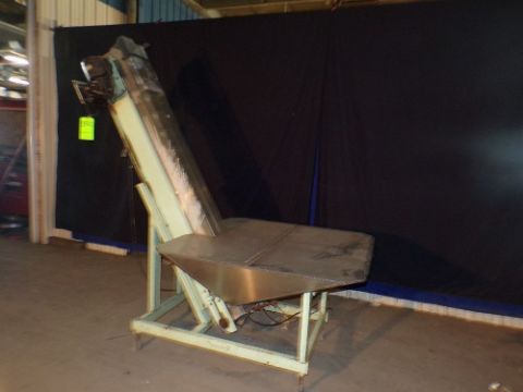 Qty (1) Hoppman Flighted Cap, Bottle or Parts elevator - Painted carbon steel frame with all stainless steel hopper and other contacts except cleated conveyor. - Hopper inverted pyramid 48' W X 48' L X 18' D. - Cleated belt 8' wide with 2' tall flight on 6' centers. - Discharge height approx 72'. 115 volt 1/4 hp dc drive., Model HOPPER, S/N 10328