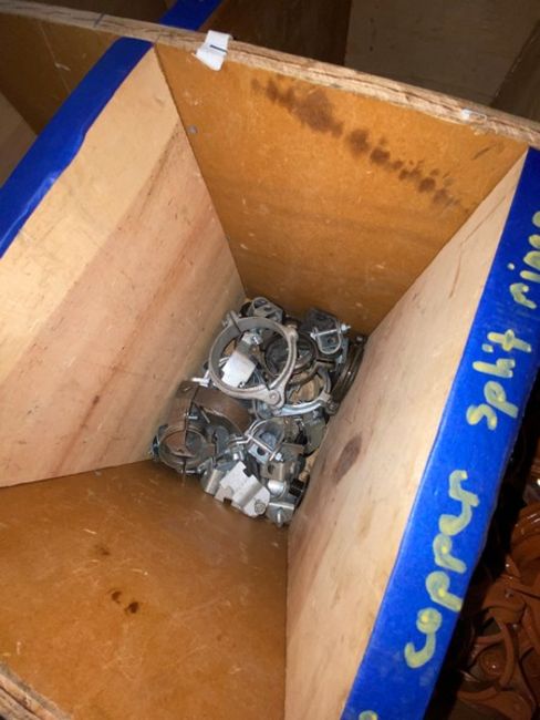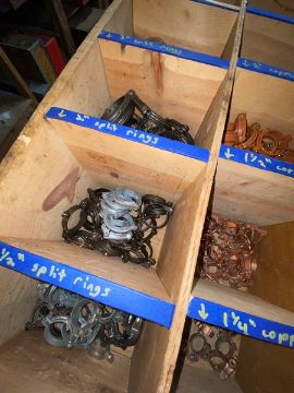 19-Compartment Split Ring Caddie, Section of 1-1/4” Split Rings, Section of 1-1/2” Split Rings, Section of 2” Split Rings, Section of 3” Split Rings, Section of 1/2” Strut Wraps, Section of 2” Copper Split Rings, Section of 1-1/2” Copper Split Rings, Section of 1-1/4” Copper Split Rings, Section of 1” Copper Split Rings, Section of 1” Split Rings, Section of 3/4” Split Rings, Section of 3/8” Copper Split Rings, Section of 1/2” Split Rings, Mounted on Casters (LOCATED IN MONROEVILLE, PA)(RIGGING, LOADING, & SITE MANAGEMENT FEE: $50.00 USD)