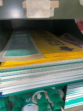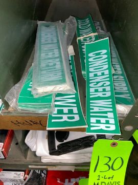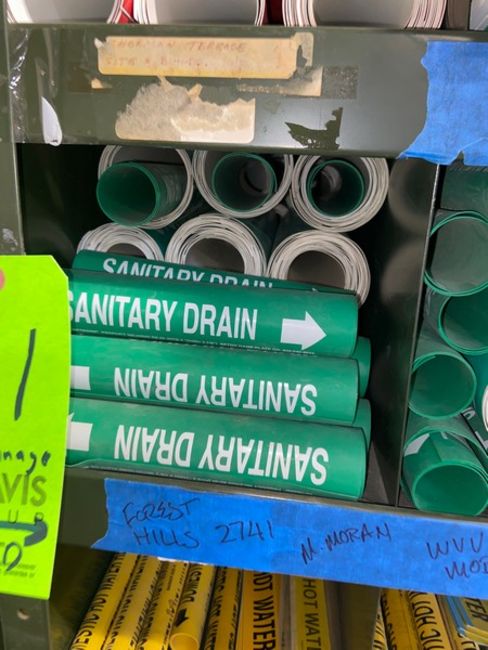 Lot of Assorted Pipe Signage, Includes Green & Yellow Signage, Labels Include Sanitary Drain, Natural Gas, Non Portable Water, Condenser Water, & Others (LOCATED IN MONROEVILLE, PA)(RIGGING, LOADING, & SITE MANAGEMENT FEE: $25.00 USD)