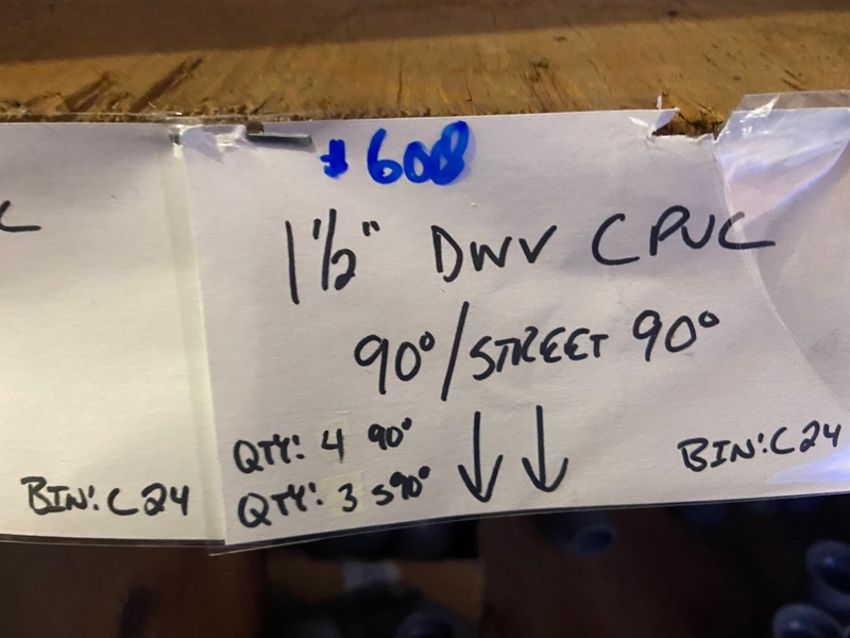 (1) 1 1/2” DWV CPVC CROSS (Bin:C24); (8) TEE 1 1/2” DWV CPVC TEE/ CLEAN OUT TEE; (1) C/O (Bin:C24); (2) 1 1/2” DWV CPVC 90’/Street 90’ (Bin:C24); (3)1 1/2” DWV CPVC P-Trap (Bin:C24); (5)1 1/2” DWV CPVC WYE (Bin:C24)(LOCATED IN MONROEVILLE, PA)
