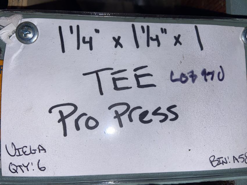 (12) VIEGA 3/4”x1/2”x3/4 Tee Pro Press (Bin:A60); NIBCO (1) 1 1/2” 1 1/4” x 1 1/4” Pro Press; (12) VIEGA 3/4" X 1/2" X 1/2" Tee Pro Press; (1) 1-1/2" x 1" x 3/4" Tee Pro Press; (1) NIBCO 3/4”x1/2”x1/2” Tee Pro Press; (9) NIBCO 1 1/4”x 1 1/4”x 1 TEE pro press (Bin:B57); (1) 1 1/4”x1”x 1/2” tee (Bin:C54); (40) 1 1/4”x 3/4”x 1 1/4”(Bin:C52/53) (LOCATED IN MONROEVILLE, PA)