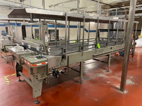 Custom Metal Design, Inc. Debagging Table, Overall Dims. of Table: Aprox. 20 ft. L x 90” W x 80” H, Length of Belt: Aprox. 17 ft., Width of Belt: Aprox. 48” W, with S/S Cover, with (2) S/S Control Panels, Wall Mounted, Includes Allen-Bradley 7-Slot PLC & (3) Allen-Bradley PowerFlex4 VFDs (LOCATED IN LOS ANGELES, CA) (RIGGING, LOADING, & SITE MANAGEMENT FEE: $2,000.00 USD)