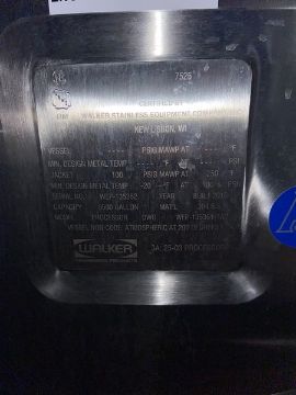 2016 Walker 3,500 Gal. S/S Jacketed Processors, M/N PROCESSOR DWG. WEP-1353361-1A, S/N WEP-135362, 304 S/S, Jacket 100 PSIG MAWP @ 250 F, Min. Design Metal Temp. -20 F @ 100 PSI, with Alcove, with (2) S/S Air Valves, with Vertical S/S Agitation with Top Mounted Motor, Formerly Operated with Glycol Jacket (Tank: TK712) (LOCATED IN LOS ANGELES, CA) (RIGGING, LOADING, & SITE MANAGEMENT FEE: $5,750.00 USD)(SUBJECT TO BULK BID FOR LOT 53A)