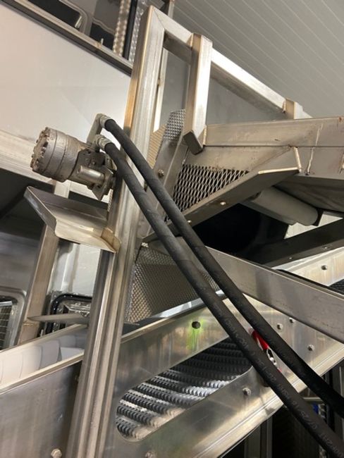 Straight Section of Incline Conveyor, Overall Length: Aprox. 15 ft., with Cleats, Cleat Spacing: Aprox. 6”, Hydraulically Driven, Mounted on S/S Frame (LOCATED IN ATWATER, CA)(RIGGING, LOADING, & SITE MANAGEMENT FEE: $350.00 USD) (SUBJECT TO BULK BID--LOT 89)