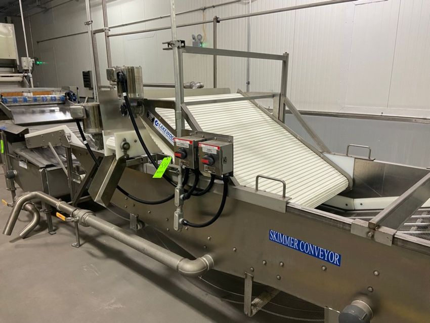 Lakewood Process Machinery S/S Skimmer Conveyor, M/N 13153-02, S/N 14-05433, with Aprox. 42” W S/S Mesh Conveyor, with Horizontal S/S Sanitizing Tank (LOCATED IN ATWATER, CA)(RIGGING, LOADING, & SITE MANAGEMENT FEE: $550.00 USD) (SUBJECT TO BULK BID--LOT 89)