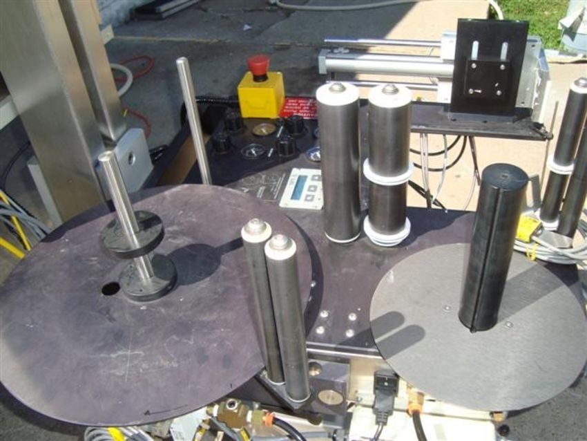 Quadrell Label Applicator, Model Q32RZ170, S/N 50114-01 (mfg 11-18-023) for Palletized Skids with Allen Bradley PanelView 300 Micro-Controller, Mounted on SS "T" Stand on Casters, Recently removed from Squibb Plant. Missing Control Board Inside Allen Bradley Panel. 120/60/1, OAD's 45" L x 43" W x 76" H, According to Quadrell the AB Panel was used for Bar Codes. Please inquire for shipping rates. (Crating and Loading Fee $350) (Located Hortonville, WI)