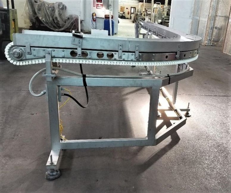 Aprox. 8" W x 16' L S/S Sanitary Intralox Conveyor with 90 Degree Turn, 1/2 hp Drive, 208/230/460 V, Electric Eye, Infeed and discharge height is 45 inches. This is adjustable with foot pads, 2 Inch siderails the entire length of the conveyor -- This system was last used in a Tyson Foods Plant and just removed from service. System is in excellent working condition. This system should ship flatbed. Not sure we can get a common carrier to take this due to the length of the unit. (Loading Fee $250) (Located Hortonville, WI)