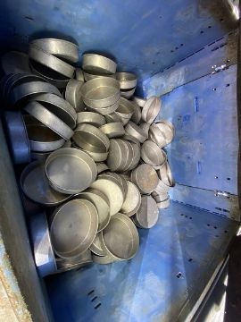 Lot of Assorted 8” Round Aluminum Pans, Aprox. (200) Pans with Aprox. 48” L x 45” W x 49” H Plastic Bin with Lid (INV#83426)(Located @ the MDG Auction Showroom 2.0 in Monroeville, PA)(Handling, Loading & Site Management Fee: $50.00 USD)