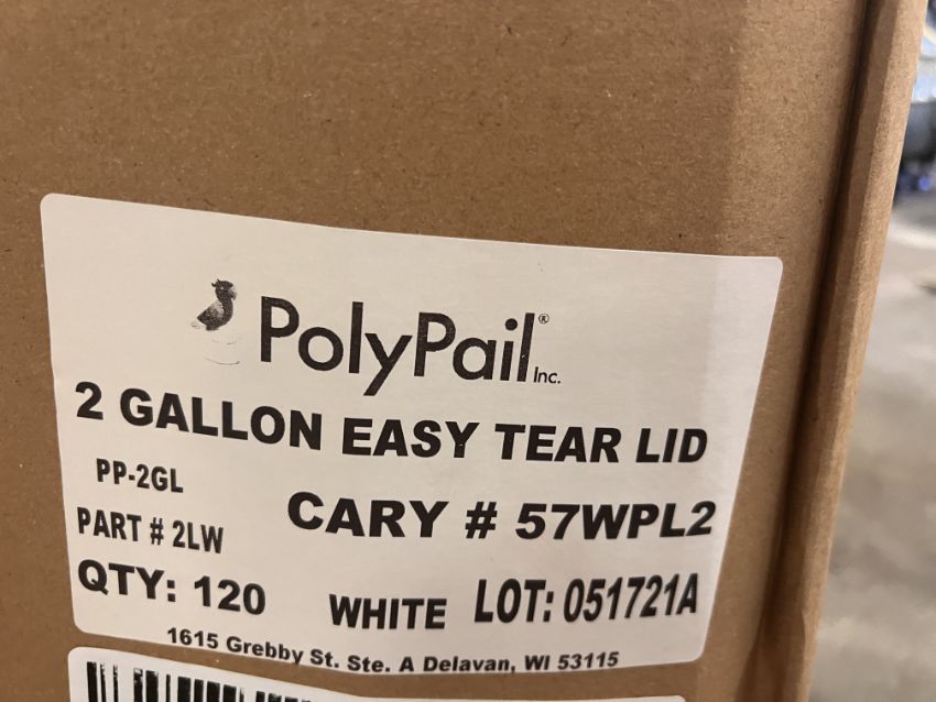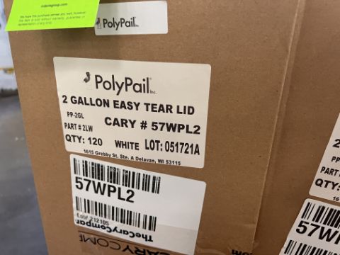 POLYPAIL 2-GALLON BUCKETS, ESAY TEAR LID STYLE, (4) BOXES, (120) PER BOX (LOADING FEE: $20.00 USD) (LOADING WILL BE CONDUCTED BY BENKART RIGGING; PLEASE COORDINATE LOADING ARRANGEMENTS WITH BENKART RIGGING 724-776-1580) (LOCATED IN CALLERY, PA)