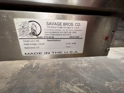 2018 SAVAGE BROS S/S LIFT AND DUMP TRUCK, MODEL 0710-20 SS, S/N 073337, 400 LB WEIGHT LIMIT (LOADING FEE: $200.00 USD) (LOADING WILL BE CONDUCTED BY Rigging & Transportation Solution Inc.; PLEASE COORDINATE LOADING ARRANGEMENTS WITH Todd Shurtz 412-801-9661) (LOCATED IN HERMITAGE, PA)