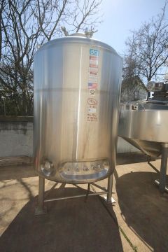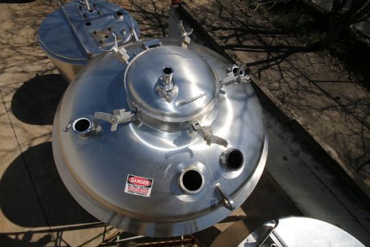 DCI Aprox. 700 Gallon Dome Top, Dome Bottom Jacketed S/S Tank, SN JS2295, MAWP 60/15 psi @ 300°F, with Top Pressured Lid, Sprayball, (4) 3" & 4" Top CT Connections, 3" CT Bottom Connection with Valve, (7) 1" & 2" CT Top Side Connections Aprox. Overall Dims. 120" H x 60" W, Rig & Tank Saddles (INV#95313)(MDG Auction Showroom Pittsburgh, PA) Loading, handling, site management fee: $800)