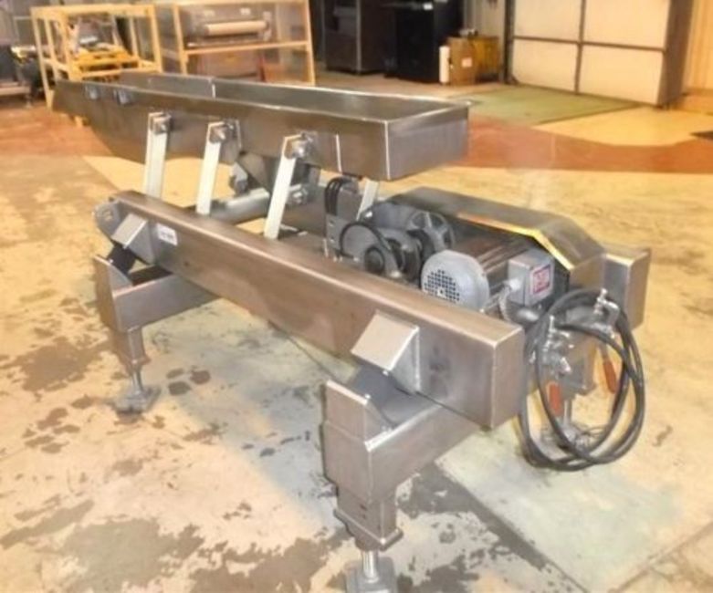 FMC Link Belt S/S Sanitary Vibratory Feeder (now owned by PPM Technologies) - Main Feed Pan 12" W x 6" D x 84" L, 1 hp, 230/460 V, 3.6 / 1/8 amps, Discharge Height 35". This Adjustable, Foot Pad Mounting to Floor, All S/S Construction, OAD's: 42" W x 104" L x 43"H, Last Used in Food Industry, Used in Excellent Working Condition, Will Crate for $250 to Ship Common Carrier (Located Hortonville, WI)