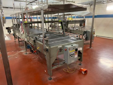 Custom Metal Design, Inc. Debagging Table, Overall Dims. of Table: Aprox. 20 ft. L x 90” W x 80” H, Length of Belt: Aprox. 17 ft., Width of Belt: Aprox. 48” W, with S/S Cover, with (2) S/S Control Panels, Wall Mounted, Includes Allen-Bradley 7-Slot PLC (3) Allen-Bradley PowerFlex4 VFDs (LOCATED IN LOS ANGELES, CA) (RIGGING, LOADING, SITE MANAGEMENT FEE: $2,000.00 USD)