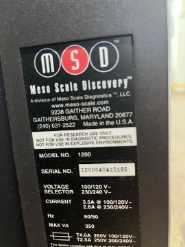 (3) MSD Meso Scale Discovery (3) MSD Meso Scale Discovery Model No. 1200 Serial No. 1200120601705 Voltage 100/120V 230/240 V Hz 60/50 MAX VA 350. (INV#98636) (Located @ the MDG Auction Showroom 2.0 in Monroeville, PA) (Handling, Loading & Site Management Fee: $25.00 USD) 1200 MDG Auction Showroom 2.0 in Monroeville, PA.