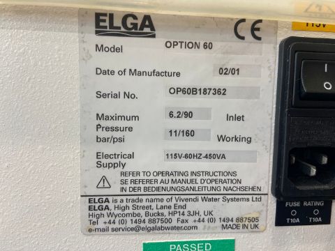 ELGA Water Purification System, M/N Option 60, S/N OP60B187362 (INV#99496) (Located @ the MDG Auction Showroom 2.0 in Monroeville, PA) (Handling, Loading & Site Management Fee: $25.00 USD)