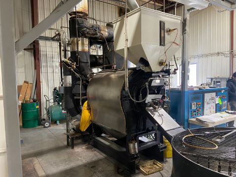Jabez Burns 23R ACO Recirculating Coffee Roaster, M/N 23R29, with Maxon Gas Burner, M/N 400, Size 4224, with De-Stoning Station with (2) Distribution & Collection Bins, with Steel Platform & Control System 500 lb. Roaster (Allen-Bradley PLC) (RIGGING, LOADING, & SITE MANAGEMENT FEE: $13,900.00 USD) (LOCATED IN ONEONTA, N.Y.)
