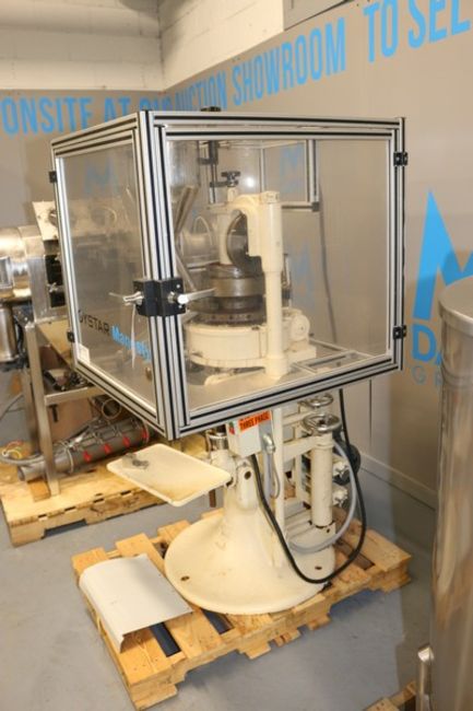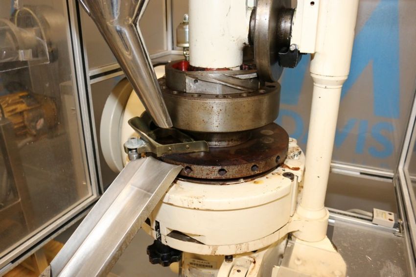 Manesty/Oyster Rotary Tablet Press, M/N B3B, S/N 277252, 16 station, 6.5 ton compression pressure, 5/8" max tablet diameter, 11/16" max depth of fill, keyed upper punch guides, single sided with feed frame and hopper, rated up to 42,000 tablets/hour throughput, with S/S Infeed Chute (INV#78123)(Located @ the MDG Showroom - Pittsburgh, PA)(Loading, Handling & Site Management Fee: $100 USD)