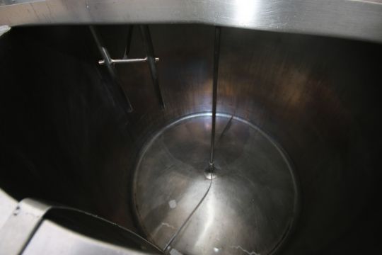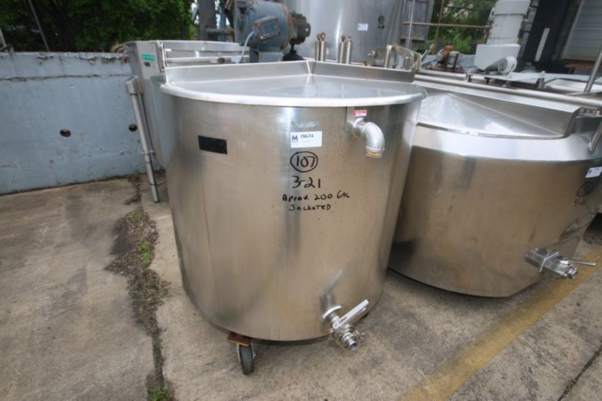 Aprox. 200 Gal. Hinged Lid S/S Jacketed Mix Tank, with Top Mounted Drive Motor with Bottom Sweep Agitation with Aprox. 1/2 hp Drive Motor, with (2) 1.5" Top Threaded Top Connections, Side 2" Clamp Type Connection with Butterfly Valve, Tank Mounted on Wheels, Overall Dims.: Aprox. 52" W x 65" H (INV#78674)(Located @ the MDG Auction Showroom in Pittsburgh, PA)(Loading, Handling & Site Management Fee: $150.00 USD)