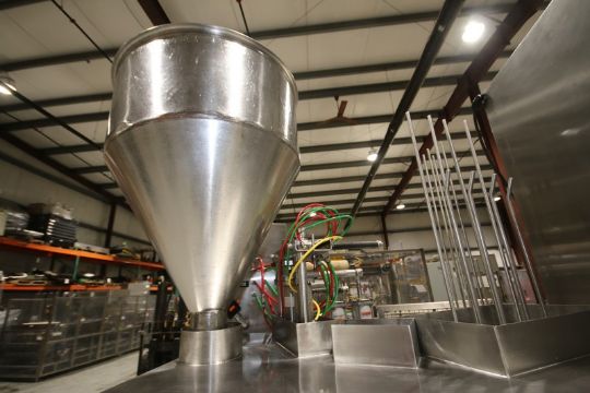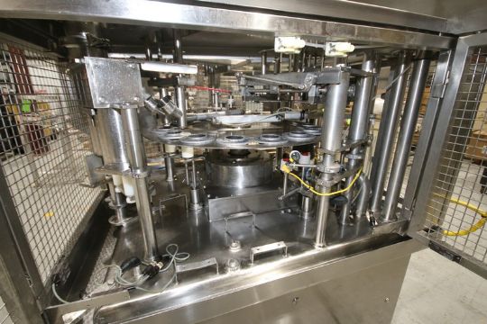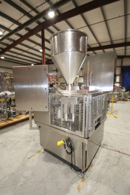 Osgood S/S Rotary Cup Filler, Model 2001-R, SN 232-790, with Filler Bowl, Cup Denester, 2-Head Tamper Evident, Lid Inserter, 2 3/4" Change Plates, (Set up to do 3.2 oz), with Allen Bradley Micro Logix 1500 PLC Controller with Panelview 600 Display, (Aprox. Overall Dims. 75" W x 84" L x 96" H) (INV#92791) (Located @ the MDG Auction Showroom in Pgh., PA)(Handling, Loading & Site Management Fee: $200)