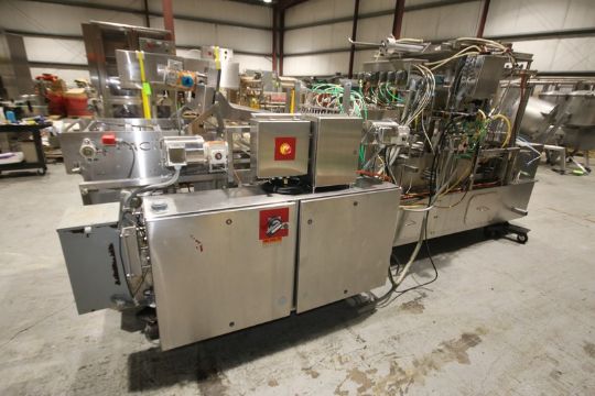 2008 PAC Tec 4 - Wide S/S Cup Filler, SN 2201, with 4 1/4" W Change Parts, Cup Inserter, Tamper Evident Sealer, Lid Inserter, Allen Bradley compact Logix L43 PLC with Touch Pad Display, Kinetix 6000 Servo Drive, (3) Powerflex 525 VFDs, 480V, (Aprox. Overall Dims. 176" Lx 75" W x 82" H), Also Includes (3) Filler Bowls, 2 3/4" W - 6-Wide Change Parts (INV#96657) (Located @ the MDG Auction Showroom in Pgh., PA)(Loading, Handling and Site Management Fee $ 300)