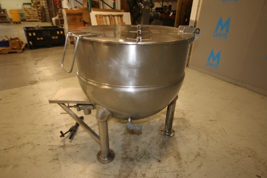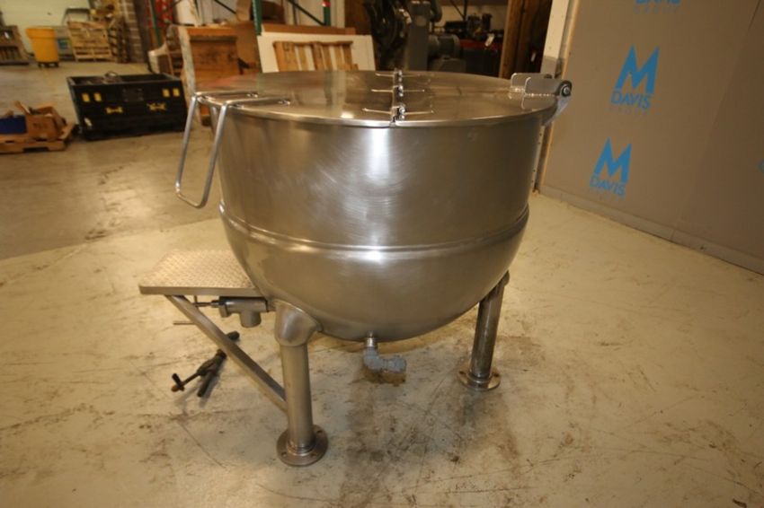 Groen 150 Gallon S/S Jacketed Kettle, Model FT-150 SN 81076-2, with Hinged Lid, 3" Threaded Bottom Connection, S/S Legs, Max WP 25 psi @ 300° F (INV#88559)(Located @ the MDG Auction Showroom in Pgh., PA)(Skidding, Handling, Loading & Site Management Fee: $500)