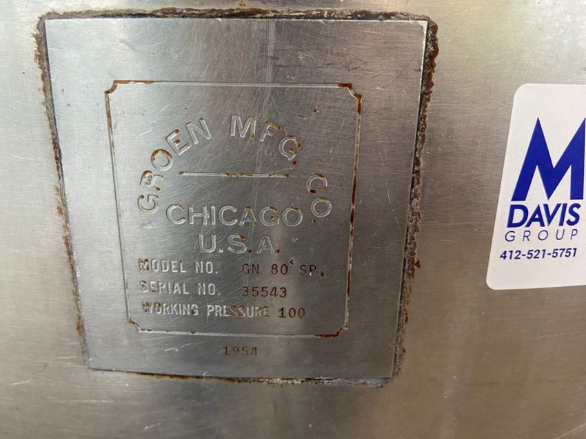 Groen 80 Gal. S/S Kettle,M/N GN 80 SP, S/N 35543, Working Pressure 100 PSI, Mounted on S/S Legs (INV#95419)(Located @ the MDG Auction Showroom in Monroeville, PA)(Handling, Loading & Site MGMT Fee: $100.00 USD)