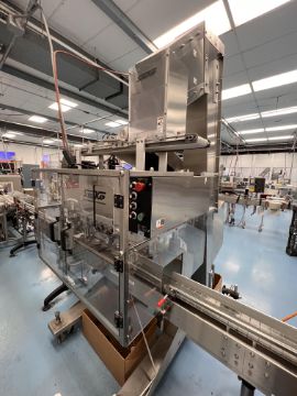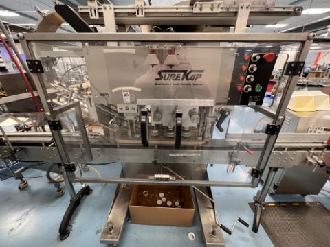 SUREKAP STRAIGHT LINE 6-SPINDLE CAPPER, MODEL SK6000-BF6, S/N AZ18678, FULLY AUTOMATIC HEAD MOUNTED HEAVY DUTY C-CHUTE CAP HOPER