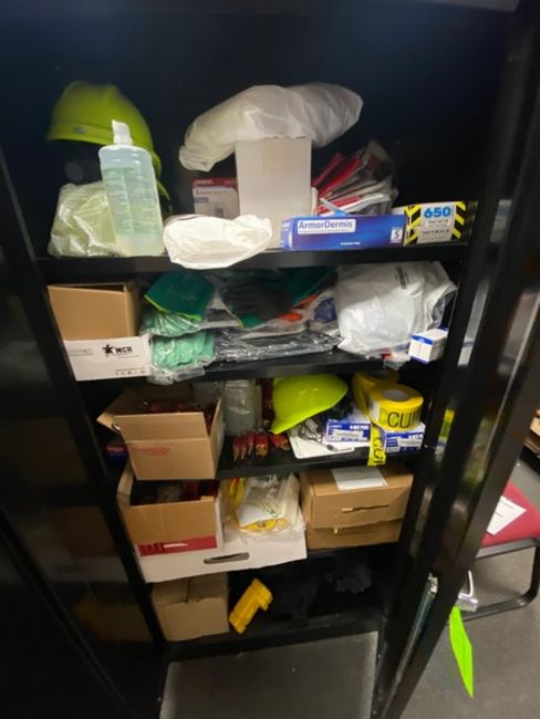 HALLOWELL DOUBLE DOOR CABINET WITH CONTENTS, INCLUDES RUBBER GLOVES, SAFETY TAPE, HARD HATS, & OTHER CONTENTS