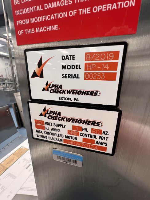 2019 ALPHA CHECKWEIGHER, MODEL HP-14, S/N 00253, INCLUDES BOTTOMLESS SPACING / TIMING INFEED, REJECT STATION, 1-PHASE, 110 V, 24 DC