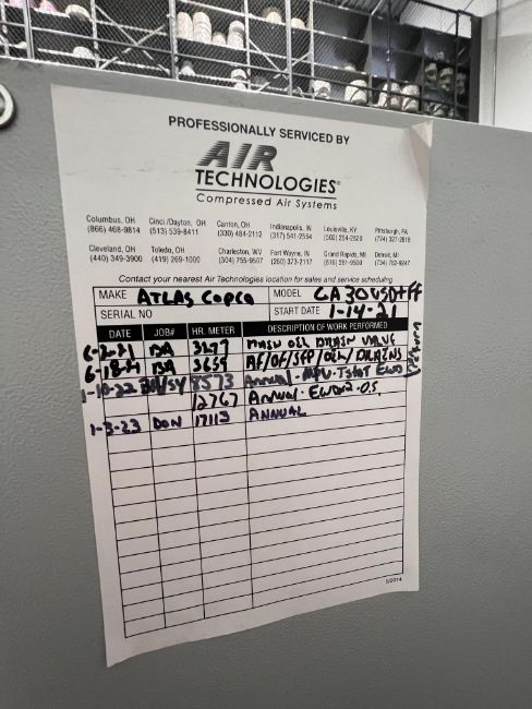 2018 ATLAS COPCO AIR COMPRESSOR, MODEL GA30VSD+FF, S/N AP1838082, 40 HP, 7400 RPM, APPROX. 20,700 HOURS, MAWP 12,75 BAR, 185 PSI, 460 V, 60 HZ, 3 PHASE