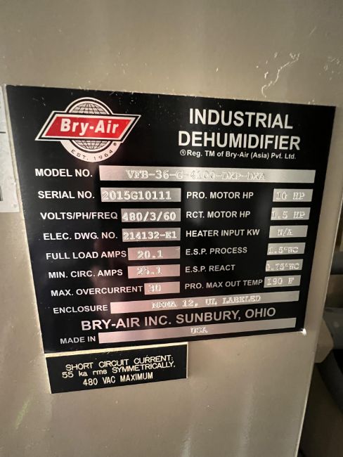 BRY-AIR INDUSTRIAL DEHUMIDIFIER, MODEL VFB-36-G-4100-DXP-DXA, S/N 2015G10111, 480/3/60, INCLUDES PRE-COOLER AND POST-COOLER AIR CONDITIONING UNITS (DH13)