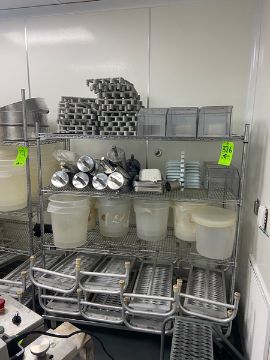 (2) Shelving Units with Contents, Includes Aluminum Stools, Plastic Buckets, Aluminum Scoops, & Other Present Contents