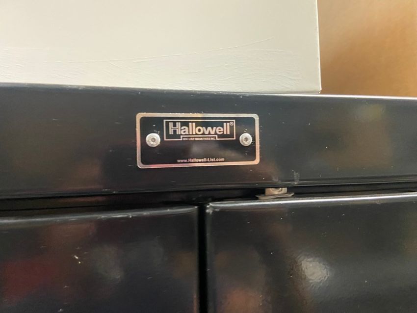 HALLOWELL DOUBLE DOOR CABINET WITH CONTENTS, INCLUDES SAFETY SHOES BY REEBOK, PUMA, TIMBERLAND, & RUBBER COVERS FOR TENNIS SHOES HALLOWELL DOUBLE DOOR CABINET WITH CONTENTS, INCLUDES RUBBER GLOVES, SAFETY TAPE, HARD HATS, & OTHER CONTENTS