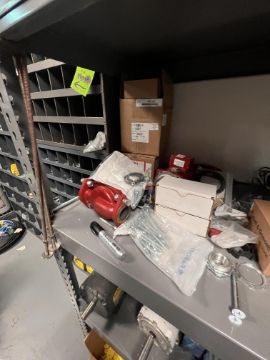 METAL RACK WITH CONTENTS, INCLUDES SHUT OFFS PANELS, PUMP COMPONENTS, MOTORS, BOOSER PUMP COMPONENTS, VALVES AND FIRE SUPPRESSION COMPONENTS AND MORE
