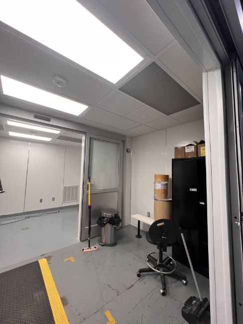 MODULAR CLEAN ROOM, QA SAMPLING 1, INCLUDES (2) AUTMATIC SLIDING DOORS, (4) CAMFIL HEPA UNITS, APPROX. INTERIOR DIMENSIONS: 17FT10IN L X 13FT6IN W X 8FT7IN H, EACH DOOR APPROX. 42 IN. W (4) APPROX 42 IN. DOORS