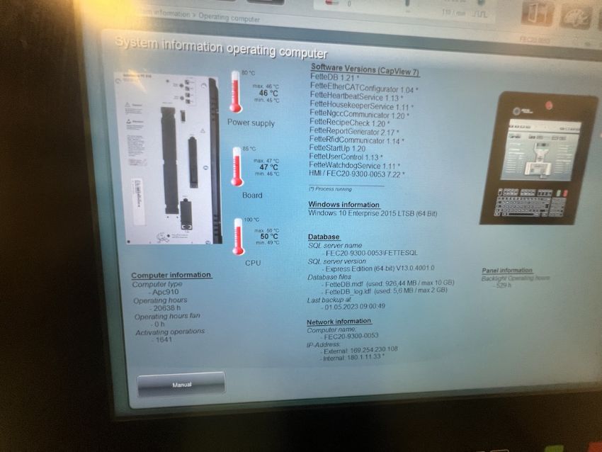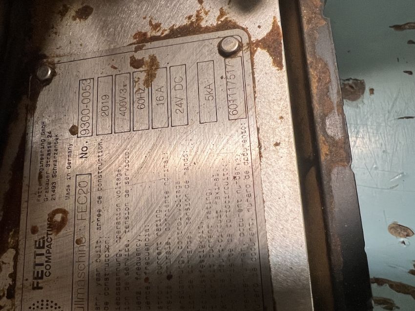 2019 FETTE COMPACTING CAPSULE FILLING MACHINE (ENCAPSULATOR), MODEL FE20, MACHINE DESIGNATION 9300-0053, APPROX. 5460,2 OPERATING HOURS, INCLUDES FETTE HMI