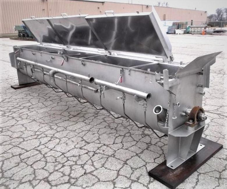 CSE S/S Sanitary Steam Injected Screw Cooker / Blancher, Model CCS.2014.W, S/N 85002, Aprox. 20" Dia. x 14 ft. with Aprox. 20" Dia. x 14 ft. L Auger, 10 Bottom Steam Injected Ports, 3-Hinged Covers, Insulated Sidewalls, 2.5 hp, 208-230/190 Volt Motor thru Reducer, Chain and Sprocket. This unit was last used in the food industry. This unit will need to ship via Flatbed due to the length (Loading Fee $500) (Located Hortonville, WI)