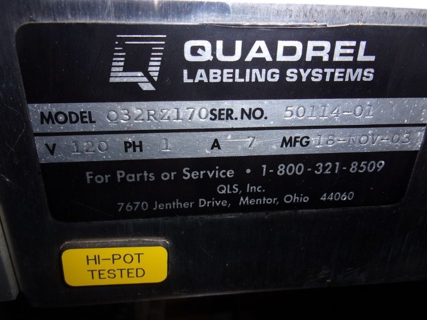 Quadrell Label Applicator, Model Q32RZ170, S/N 50114-01 (mfg 11-18-023) for Palletized Skids with Allen Bradley PanelView 300 Micro-Controller, Mounted on SS "T" Stand on Casters, Recently removed from Squibb Plant. Missing Control Board Inside Allen Bradley Panel. 120/60/1, OAD's 45" L x 43" W x 76" H, According to Quadrell the AB Panel was used for Bar Codes. Please inquire for shipping rates. (Crating and Loading Fee $350) (Located Hortonville, WI)