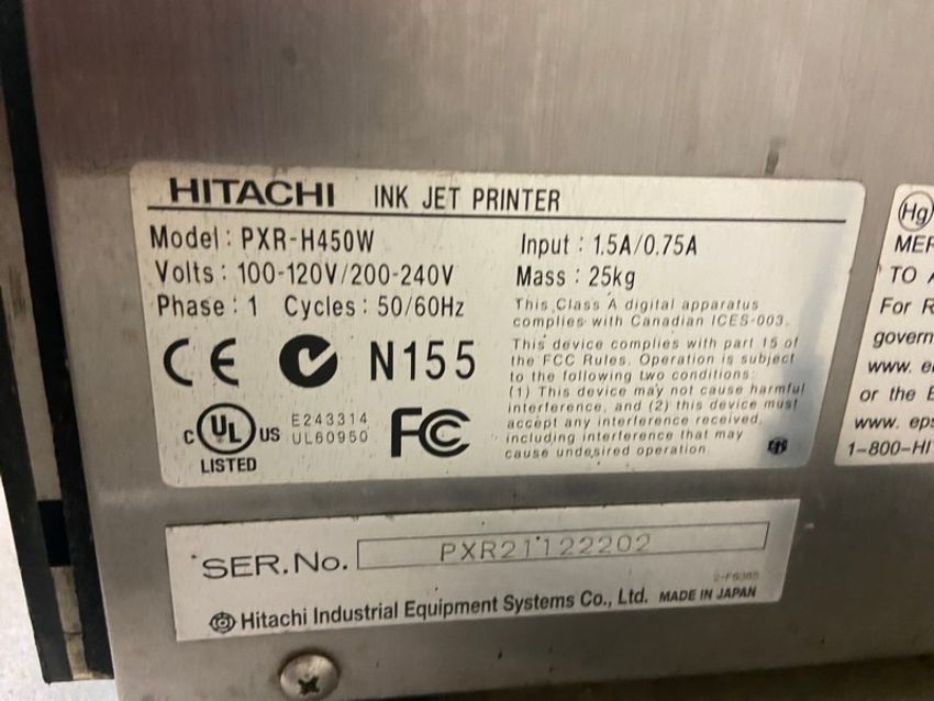 HITACHI Ink Jet Printer, M/N PXR-H450W, S/N PXR21122202, 100-120/200-240 Volts, 1 Phase, with Ink Head, Mounted on S/S Stand (LOCATED IN CRYSTAL CITY, TX)(RIGGING, LOADING, & SITE MANAGEMENT FEE: $50.00 USD)