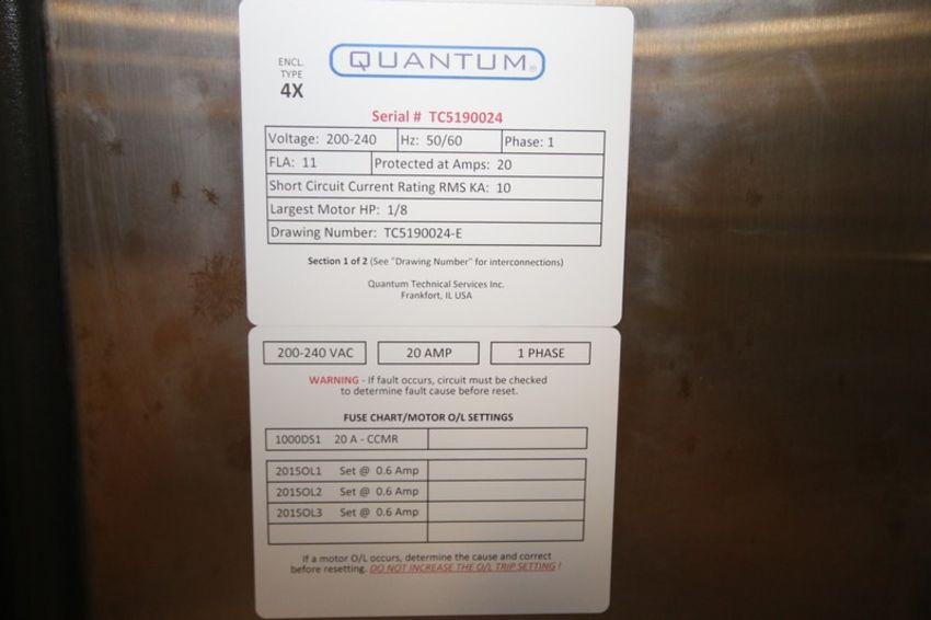 Quantum S/S Topping Waterfall Applicator, SN TC5190024, with 20" W Conveyor, Allen Bradley Micro 850 PLC Controller with Touch Pad Display, (5) Powerflex 525 VFDs, 200-240V(INV#99545) (Located @ the MDG Palmer Auction Showroom in Pgh., PA) (Loading, Handling and Site Management Fee $200)