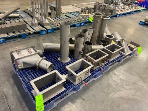 Pallet of Assorted Flexicon Auger Conveyor Components, with Discharge Valve Duct, Assorted Sizes (RIGGING, LOADING, SITE MANAGEMENT FEE: $150.00 USD)(LOCATED IN ATLANTA, GA)