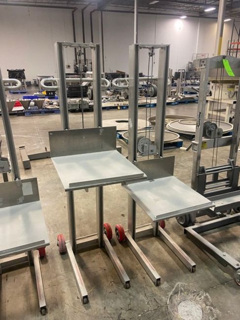 (4) Portable Lift Platforms, with Hand Crank Pulley Adjustable Lift Table, O.D. of Tables: Aprox. 20" L x 20" W, Mounted on Portable Frame, (1) Unit Set Up For Film Lift (See Photos) (RIGGING, LOADING, SITE MANAGEMENT FEE: $50.00 USD)(LOCATED IN ATLANTA, GA)