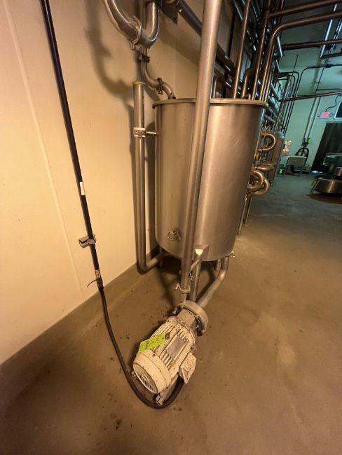 Aprox. 125 Gal. Single Wall Balance Tank, Includes 5 hp Centrifugal Pump, Tank Internal Dims.: Aprox. 3-1/2 ft. L x 2.5 ft. Dia., Mounted on S/S Legs (LOCATED IN MANTECA, CA)(RIGGING, LOADING, & SITE MANAGEMENT FEE:  $250.00 USD)